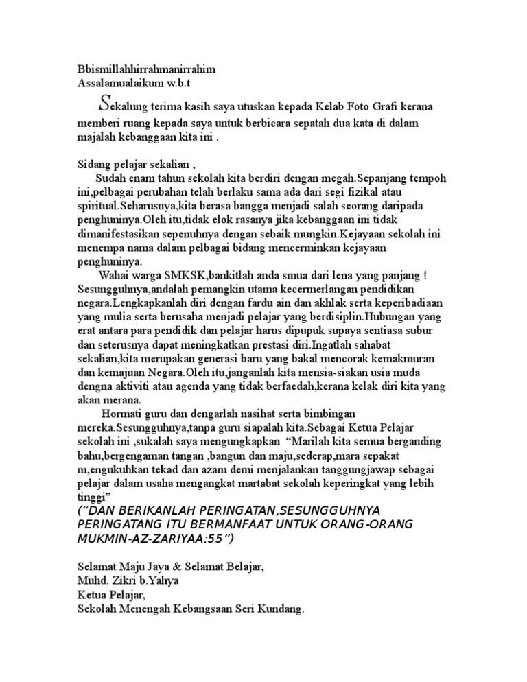 Saya percaya penerbitan majalah ini adalah hasil kerjasama dan komitmen yang tinggi semua warga. Contoh teks ucapan pengarah program. 2 sekolah Malaysia tersenarai 10 teratas anugerah sekolah terbaik dunia.