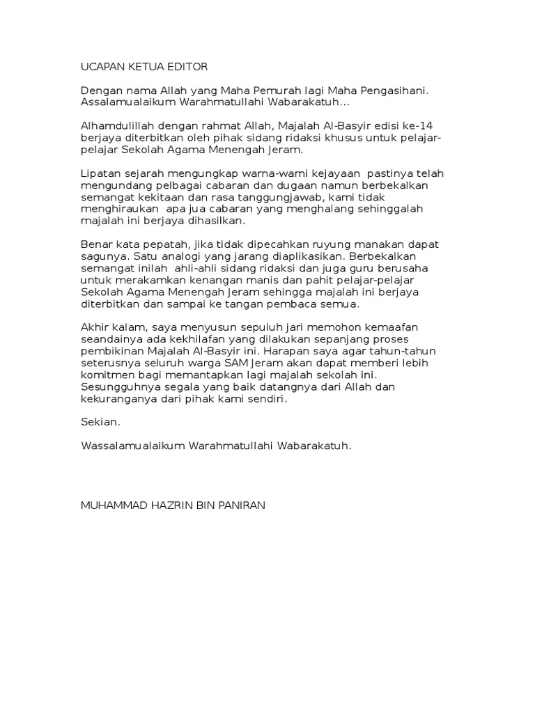 Contoh Ucapan Ketua Editor Majalah Sekolah